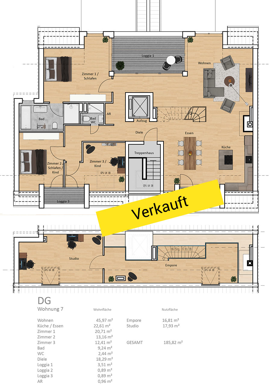 Die Dachgeschosswohnung verfügt über zwei Ebenen. Eigene Aufzugstation in der unteren Wohnebene. Zusätzlicher Lifter auf der oberen Galerie. Bei dieser Wohnung erwerben Sie ca. 186 m² und bezahlen nur 151 m²!