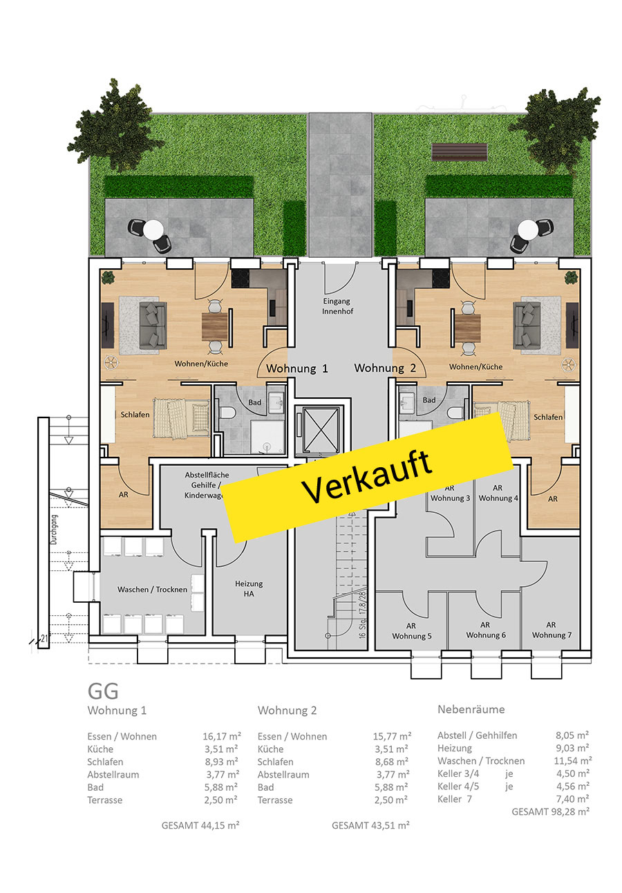 Zwei, Drei- und Vierzimmerwohnungen. Eigene kleine Gartenflächen im Erdgeschoss mit Terrassen.
